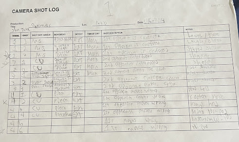 I found out that the shot log wasn't nearly as easy as I thought it was going to be. Although the document itself doesn't require anything extreme, the actual process of filling it out is a hard one. You have to make sure you capture every take your team does. If you don't, then it could set you far back in editing as you would have to reanalyze all the takes you did to see which line up to your log ad which you missed. It is also difficult to fully write a distinction between the takes you did. A shot generally had one clear description, so it was best to use the notes section and try to find a little difference in detail even if it's something in the background to help you justify the take you decide to use or distinguish two very similar takes. A messy shot log would lead to a harder time when it came to editing so I now know what to expect for the next time we shoot.